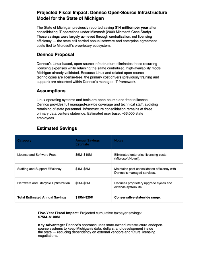Today, many of the State’s core services are hosted with Microsoft under enterprise agreements that require ongoing payments for cloud hosting, software licensing, and related services. Dennco’s proposal, the Dennco & State of Michigan Partnership Plan, outlines an alternative path: gradually moving targeted workloads to Dennco-operated infrastructure and lower-cost platforms, while maintaining security, reliability, and compliance.