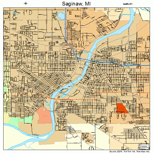 Map of Saginaw showing angled roads like Genesee and Gratiot, shaped by the original plank road system.
