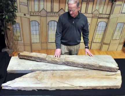 Castle Museum Exhibit "At the Castle Museum of Saginaw County History, historian Thomas B. Mudd presents several three-inch thick white pine planks discovered beneath East Genesee Avenue by road crews in 2010. Originally laid in 1851 under the direction of Saginaw founder Norman Little, these planks were part of the historic Saginaw–Flint Plank Road—later maintained by the Rieder family as tollkeepers.
